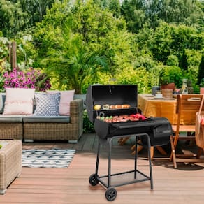 Churrasqueira a Carvão com Defumador 2 em 1. Dimensoes: 115 cm (L) x 68 cm (P) x 106,5 cm (A). Peso bruto: 26,7 kg. Area de coccao: 64x41 cm. Inclui tampa e rodas para facil movimentacao. Material: Aco. Cor: Preto. Procedencia: Importado da China. Garantia: 6 meses.Vendido por Home Living e entregue por PontoFrio