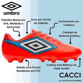 O cabedal (parte superior do calçado) é construído em material sintético laminado de fácil manutenção e limpeza com textura suave. Possui arte gráfica com cores contrastantes em serigrafia, Diamante Umbro na lateral, forro interno em poliéster e palmilha macia em EVA com tecido forrado. O solado de campo FG contém 14 travas em PVC com costura de reforço na parte frontal para maior durabilidade e firmeza.