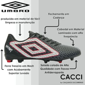 Cabedal assimétrico confeccionado em material laminado com alta frequência e grafismo em serigrafia de 3 cores. Possui forro traseiro em Mesh com acabamento superior luvado para maior conforto, maxi Diamante Umbro Outline na lateral com assinatura do modelo e palmilha interna em EVA conformado para proporcionar um calce macio. O solado de campo FG de 10 travas, com 2 travas centrais de tração, é construído em TPU com travas bicolores posicionadas.