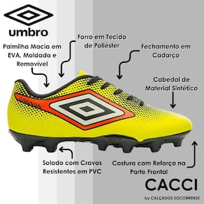 Seu cabedal é construído em material sintético laminado com aplicação de grafismo reticulado e forro em tecido de poliéster. Possui Diamante Umbro na lateral estilizado com a assinatura do modelo, atacador convencional e palmilha interna em EVA forrado. O solado de campo FG de 14 travas é construído em PVC.