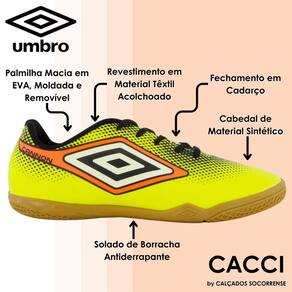 Feita pela Umbro, a chuteira Cannon, foi pensada para os jovens craques que buscam melhor desempenho dentro das quadras nas partidas de futsal. Com cabedal em sintético, além de contar com solado em borracha antiderrapante.