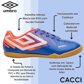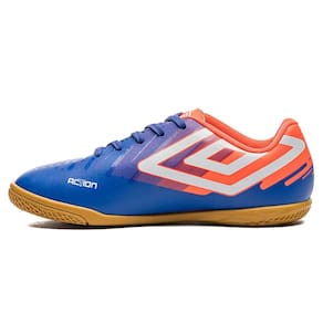 Indicada para jogadores infantis e juvenis, de nível iniciante, que se destacam dentro das quadras, a Chuteira Futsal Umbro Action Jr exibe artes gráficas personalizadas aplicadas em camadas, com efeito degradê, para um visual autêntico e moderno no melhor estilo Umbro.