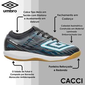 Cabedal assimétrico construído em material laminado emborrachado liso, com toque macio, e detalhes em janelas de alta frequência. Possui calce tipo meia em tecido com elastano e acabamento em debrum, grafismo camuflado geométrico em serigrafia, maxi Diamante Umbro aplicado na região frontal, assinatura do modelo na lateral externa da parte posterior e palmilha interna em EVA forrado. O solado de futsal é composto por borracha monocolor antiderrapante e entressola em EVA para maior conforto.