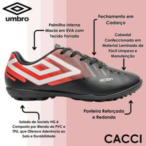 Cabedal confeccionado em material laminado de fácil limpeza e manutenção. Possui grafismos em “layers” com aplicação de verniz incolor sobre as artes, Diamante Umbro em destaque na lateral, assinatura do modelo na parte frontal e palmilha interna macia em EVA com tecido forrado. O solado de society HG é composto por blenda de PVC e TPU, que oferece aderência ao solo e durabilidade.