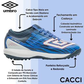 Cabedal assimétrico construído em material laminado emborrachado liso, com toque macio, e detalhes em janelas de alta frequência. Possui calce tipo meia em tecido com elastano e acabamento em debrum, grafismo camuflado geométrico em serigrafia, maxi Diamante Umbro aplicado na região frontal, assinatura do modelo na lateral externa da parte posterior e palmilha interna em EVA forrado. O solado de society é composto por TPU monocolor com sistema de travas cônicas e entressola em EVA para maior conforto.