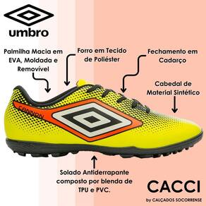 Com um design autêntico e ousado, a Chuteira Society Umbro Cannon é indicada para jogadores iniciantes que se destacam dentro do gramado sintético. O grafismo reticulado com efeito degradê traz personalidade e cores vivas no melhor estilo Umbro.