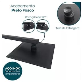 Chuveirão inox 25x25 slim parede banheiro black fosco A ducha possui bicos de silicone que possibilitam um bom fluxo dágua e aumentam a sua durabilidade, conta com um sistema de articulação de 20 que permite ajustar a posição da ducha para um banho mais confortável. Ducha na cor preto fosco, feito em aço inox 201 garante dureza e resistência ao produto, reduzindo a oxidação. A ducha também conta com uma tela para filtragem de água arenitos ou detritos reduzindo possíveis entupimentos dos bicos da ducha.