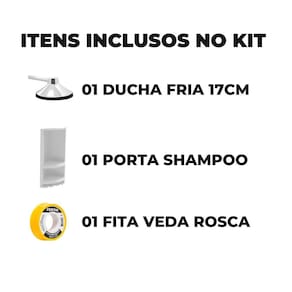 ITENS INCLUSOS 01 Chuveiro Ducha Fria Redondo 01 Porta Shampoo 01 Fita Veda Rosca12mm x 5m