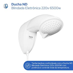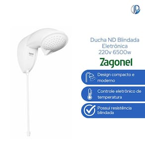 Ducha ND Blindada Eletrônica Zagonel 220V 6500W - Chuveiro Elétrico com Controle Gradual de Temperatura e Resistência Blindada A Ducha ND Blindada Eletrônica Zagonel 220V 6500W é a escolha ideal para quem busca um chuveiro elétrico potente, seguro e moderno, com controle eletrônico de temperatura. Com 6.500W de potência, aquece a água de forma rápida e eficiente, garantindo banhos quentes e confortáveis mesmo nos dias mais frios. Seu ajuste gradual de temperatura é feito por uma haste lateral prática, sem a necessidade de desligar o aparelho, proporcionando muito mais comodidade e economia de energia. O espalhador com 78 jatos oferece um fluxo de água uniforme e intenso, ideal para quem valoriza o conforto no banho. Outro diferencial é sua resistência blindada, que garante maior durabilidade, segurança e facilidade de manutenção. Esse tipo de resistência reduz o risco de queima por acúmulo de resíduos e torna o banho ainda mais seguro. Com design moderno, a ducha é produzida em material termoplástico de alta resistência e possui grau de proteção IP24, sendo segura contra respingos. É compatível com disjuntor DR, aquecimento solar e sistemas a gás, adaptando-se a diferentes tipos de instalações.