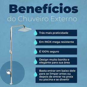 O chuveiro externo em inox é um produto moderno e elegante que foi projetado para oferecer um banho refrescante ao ar livre. Feito com materiais de alta qualidade, o chuveiro é resistente à corrosão e resistente o suficiente para suportar as condições climáticas externas. Com um design sofisticado, ele é ideal para ser instalado em áreas externas, como jardins, varandas e áreas de piscina. Além disso, o chuveiro externo em inox é fácil de instalar. Com o chuveiro externo em inox, você pode desfrutar de um banho refrescante ao ar livre, proporcionando uma experiência única e agradável nos dias quentes de verão. Marca: Loja beluga