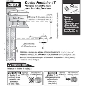 Para distâncias maiores consulte um profissional habilitado. Quando ocorrer variação na tensão (voltagem) também ocorrerá variação na temperatura da água. O circuito elétrico deverá ter também o condutor de aterramento com impedância máxima de 2 (ohms), o qual deverá ser conectado ao condutor verde-amarelo da Ducha Faminho, para garantir a proteção do usuário.