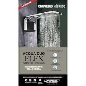 Especificações Marca: Lorenzetti Linha: Acqua Ultra Modelo: Acqua Duo Flex Cor: Preto e cromado Potência: 6800 W Voltagem: 220 V Fios mm² : 4 Disjuntor A : 32 Pressão de funcionamento: 10 a 400 kPa 1,0 a 40 m.c.a. Grau de proteção: IP 24 Sistema de aterramento: Sim Comando eletrônico de temperaturas: Sim Compatível com Dispositivo Diferencial Residual DR : Sim Instalação sem cano: Sim Compatível com aquecimento solar: Sim Garantia do fabricante: 1 ano contra defeitos de fabricação