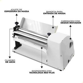 Com rolos de 40cm, ele permite trabalhar com massas de até 40cm de largura, sendo o único da categoria com essa capacidade.