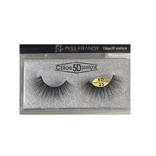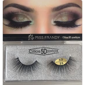 Os cílios postiços 5d-25 da miss frandy foram feitos para você que gosta de cílios grandes e curvados, mas ainda sim quer um acabamento natural. Os cílios são 5d e totalmente sintéticos. Para um acabamento mais natural aplique máscara de cílios. Modo de usar: comece cortando as extremidades excedentes dos cílios de acordo com o tamanho dos olhos, aplique a cola na raiz dos cílios postiços e aguarde o momento ideal para aplicação, depois aplique cuidadosamente na raiz dos cílios naturais com uma pinça e espere secar. Contém: 1 par de cílios. Composição: 100% sintético.