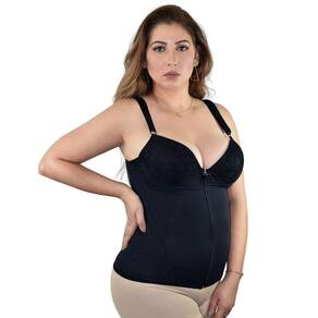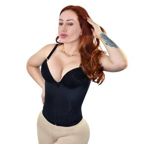 Possui abertura frontal de zíper e três colchonetes internos, para reforçar o fecho e rendas do bojo.