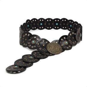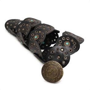 Cinto Boho Chique Classico Country Feminino Redondo Rebite de Flor Moderno Fivela Metal Ouro Velho - Preto - G