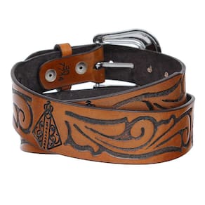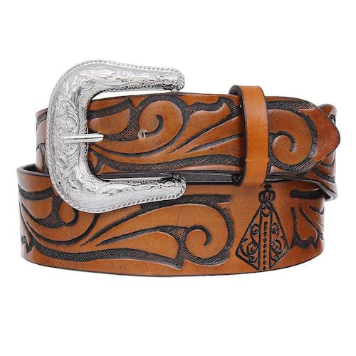 Cinto Cow Way fabricado em couro na cor Marrom com 4,5cm de largura, possui bordados (entalhados) no couro com detalhes de Nossa Senhora Aparecida e fivela de metal removível.