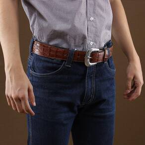 Cinto com a clássica qualidade Cow Way fabricado em couro duplado e costurado de crocodilo na cor Marrom com 4cm de largura, possui fivela de metal removível com detalhes florais. Uma peça realmente bonita e que não pode faltar em seu guarda roupa!