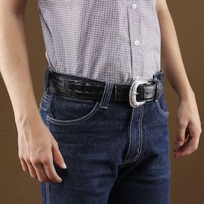Cinto com a clássica qualidade Cow Way fabricado em couro duplado e costurado de crocodilo na cor Preto com 4cm de largura, possui fivela de metal removível com detalhes florais. Uma peça realmente bonita e que não pode faltar em seu guarda roupa!