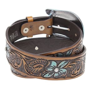 Cinto Country Feminino Master fabricado em couro na cor Marrom com 4,5cm de largura, possui bordados (entalhados), detalhes em pedras strass e fivela de metal removível.