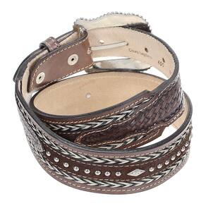 Cinto Paul Western fabricado em couro com detalhe em pelo na com Marrom com 4,5cm de largura, possui detalhes em rebites de metal, tranças em nylon e fivela removível de metal trabalhada.