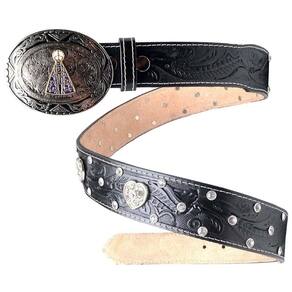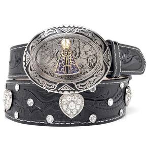 Cinto Couro Feminino Fivela Redonda Nossa Senhora de Aparecida Com Apliques Texturizado - Preto - 90