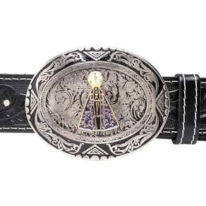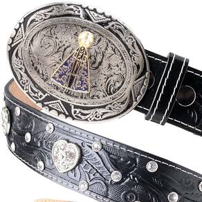 Cinto Couro Feminino Fivela Redonda Nossa Senhora de Aparecida Com Apliques Texturizado - Preto - 80