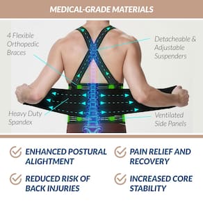 Perfeito para pessoas que exigem mais de seus corpos, nosso suporte para as costas oferece suporte direcionado para ajudar a evitar lesões e aliviar a dor nas costas causada por levantamento de peso e movimentos repetitivos. Reforça seu núcleo, estabiliza sua coluna e promove a postura adequada, permitindo que você ultrapasse seus limites e alcance novos níveis de força e desempenho.