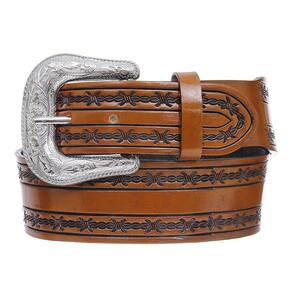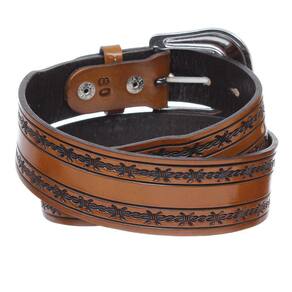 Cinto Cow Way fabricado em couro na cor Marrom com 4,5cm de largura, possui bordados (entalhados) no couro e fivela de metal removível.