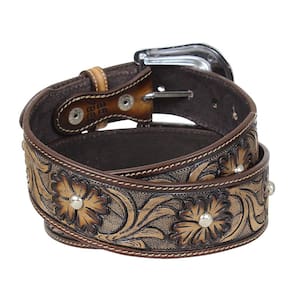 Cinto unissex na qualidade Cow Way, fabricado em couro na cor Marrom seguindo o design e tendências atuais, possui correia totalmente bordada (entalhada), estilo floral com 4,8cm de largura no centro e 4cm nas ponteiras. Este modelo vem costurado e rebitado ao longo da superfície. Tanto a fivela estilizada como o passador são removíveis, podendo ser trocados pelo usuário a qualquer momento.