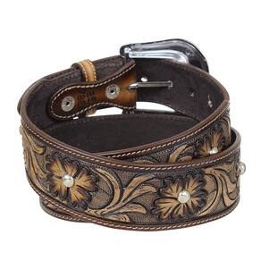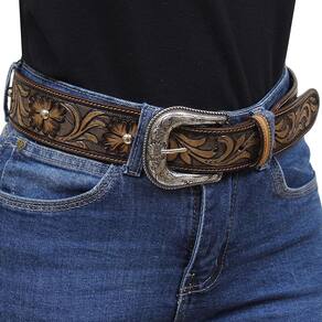 Cinto unissex na qualidade Cow Way, fabricado em couro na cor Marrom seguindo o design e tendências atuais, possui correia totalmente bordada (entalhada), estilo floral com 4,8cm de largura no centro e 4cm nas ponteiras. Este modelo vem costurado e rebitado ao longo da superfície. Tanto a fivela estilizada como o passador são removíveis, podendo ser trocados pelo usuário a qualquer momento.