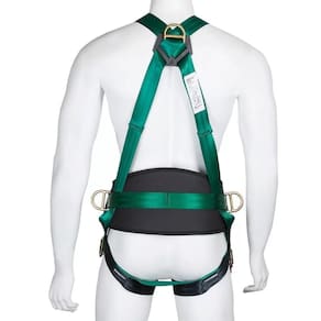 Possui ajustes através de fivelas duplas de aço, duas localizadas no suspensório, uma na cintura e duas nas pernas e três meia argolas em aço forjado bicromatizado, uma dorsal para retenção de queda e duas laterais para posicionamento.