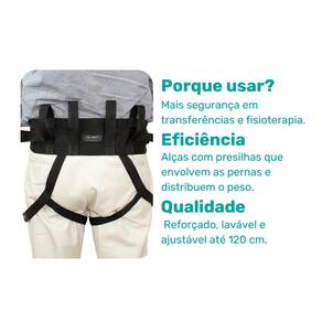 cinto de transferência com perneiras, cinto de transferência Longevitech, acessório para cuidadores, cinto para movimentação de pacientes, cinto ergonômico para fisioterapia, segurança em transferências, cinto ajustável até 120 cm, cinto lavável paciente.