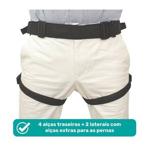 Diferente do modelo simples, este conta com alças extras com presilhas, que passam pelas pernas do paciente, distribuindo melhor o peso e impedindo que o cinto suba durante a movimentação.
