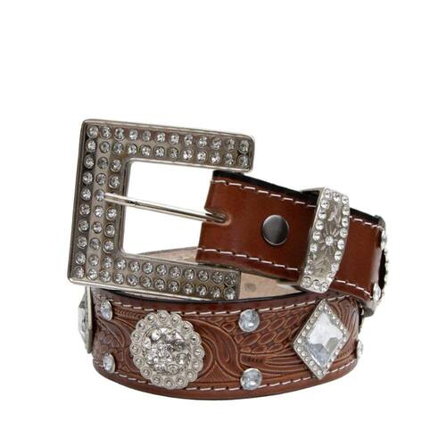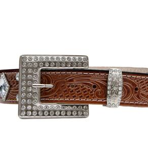 Cinto Feminino Couro Country Garota Rodeio Aplicaçao Strass Brilho Fivela Quadrada - Marrom - 95