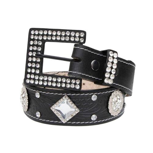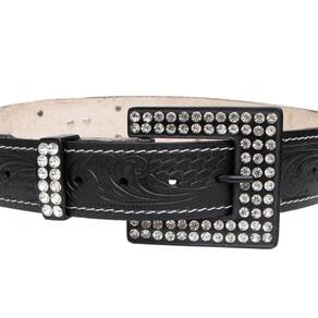 Cinto Feminino Couro Fivela Quadrada Aplicaçao Strass Boiadeira Festa do Peao Rodeio - Preto - 105