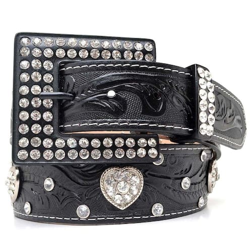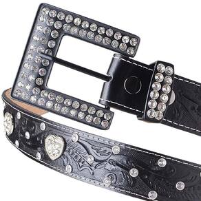 Cinto Feminino Couro Texturizado Detalhe Coração Fivela de Strass Quadrada Festa Peao Barretos - Preto - 95