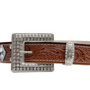 Cinto Fivela Quadrada Couro Com Strass Feminino Country Boiadeira Texturizado - Marrom - 100