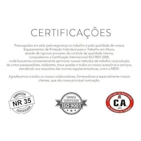 Ponto de ancoragem dorsal para retenção de queda Ponto de ancoragem peitoral dois laços para retenção de queda Ponto de ancoragem nos ombros para movimentação em espaço confinado Duas fivelas duplas de ajustes nas pernas uma em cada perna Duas fivelas duplas de ajustes na altura do peito 2 passadores para alocar a sobra de fita dos ajustes Duas alças para descanso do talabarte Fita sub-pélvica para maior conforto em caso de suspensão Tamanho único