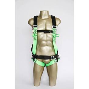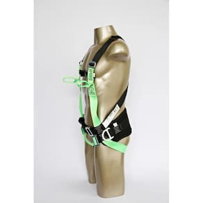 Possui 4 pontos de engate, sendo 1 duplo peitoral em poliéster, 1 meia argola dorsal em aço e 2 meias argolas laterais de aço para posicionamento.