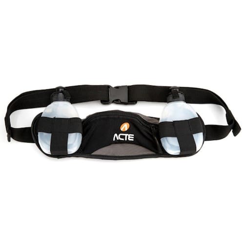 Cinturão de hidratação Acte com cinto abdominal ajustável com fechamento prático, possui bolso frontal com abertura em Tiras Autocolante. Acompanha 2 garrafas plásticas de 170 ml cada.