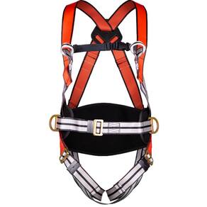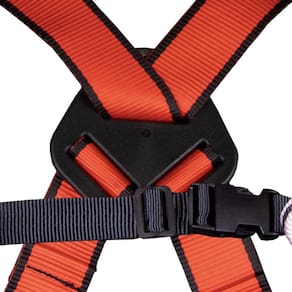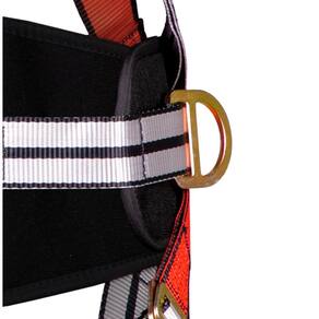 Pontos de conexão: 3 (1 argola dorsal em “D” de aço forjado; 2 argolas laterais em “D” de aço forjado; 1 ponto frontal com 2 suportes têxteis em poliéster)