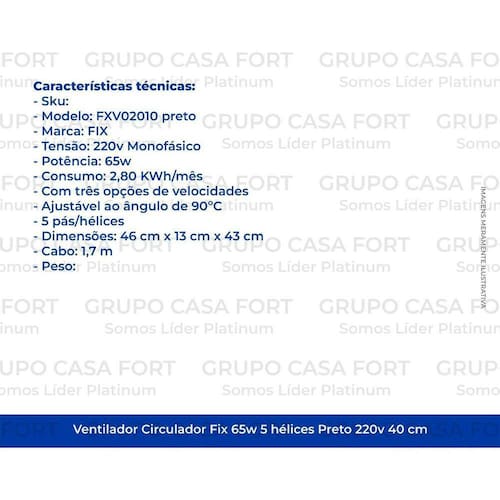 marca: Fix linha: FXV modelo: FXV02003P2 voltagem: 220V altura: 45 cm profundidade: 18 cm largura: 42.5 cm peso: 2.9 g tipo de ventilador: Circulador potencia: 65 W quantidade de velocidades: 3 inclui controle remoto: Não material da grade: Plástico com pas reversiveis: Não com luz: Não Ean: 7908161725424