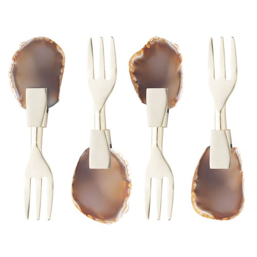 O conjunto de garfos para aperitivos é utilizado na mesa para servir queijos, frios e petiscos em geral. Possui o cabo em pedra ágata que é conhecido por sua beleza e resistência. A nobreza da ágata unido ao inox dourado, tornará seu evento ainda mais especial.