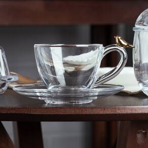 O Conjunto de xícaras e pires para chá decorados com um encantador design de pássaro dourado, proporcionando um toque de elegância e natureza à sua mesa.