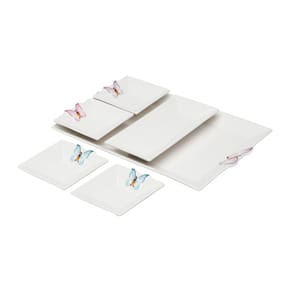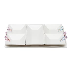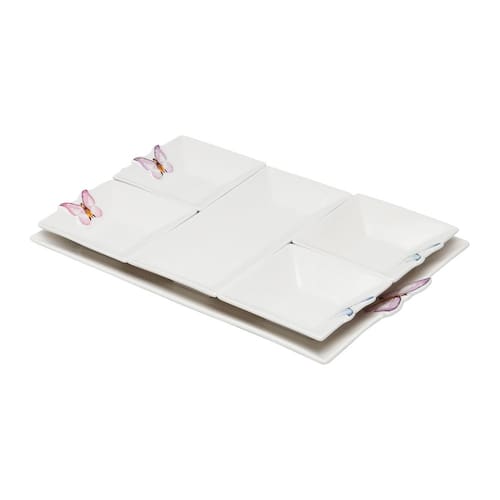 Itens inclusos: 4 Petisqueiras de Porcelana Branca Quadrada Borboletas 9,5x9,5cm Wolff 1 Petisqueira de Porcelana Branca Retangular Borboletas 19x9cm Wolff 1 Bandeja de Porcelana Branca Retangular Borboletas 30x20,5cm Wolff