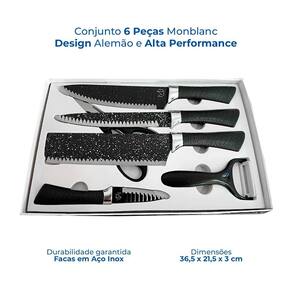 Transforme sua experiência na cozinha com esse kit de facas completo e de alta performance. O conjunto monblanc conta com 6 peças essenciais para o preparo de qualquer prato, unindo qualidade, design moderno e praticidade no dia a dia. -------------------- Itens inclusos - 1 faca chef 20cm - 1 faca trinchar 20cm - 1 cutelo 20cm - 1 faca de descascar 9cm - 1 tesoura multiuso - 1 descascador de cerâmica 9cm ------------------- Material de alta qualidade - lâminas em aço inox com revestimento antiaderente - maior resistência ao desgaste e durabilidade - corte preciso e sem esforço -------------------- Cabo ergonômico e antiderrapante - toque suave com textura antiderrapante - mais conforto e firmeza no manuseio -------------------- Design moderno e funcional - estilo alemão refinado com acabamento sofisticado - estojo elegante para armazenagem e organização - ideal para chefs, cozinheiros e uso doméstico ------------------- Uso multifuncional - corte de carnes, vegetais, frutas, peixes e mais - lâmina com áreas específicas para cada tipo de corte: - frontal: vegetais e frutas pequenas - central: cortes diversos - traseira: alimentos mais resistentes -------------------- Dimensões do estojo: 36,5 x 21,5 x 3cm -------------------- : 90 dias -------------------- Sobre nós: Especificações técnicas: Itens inclusos- 1 faca chef 20cm- 1 faca trinchar 20cm- 1 cutelo 20cm- 1 faca de descascar 9cm- 1 tesoura multiuso- 1 descascador de cerâmica 9cm Marca: Não Informado