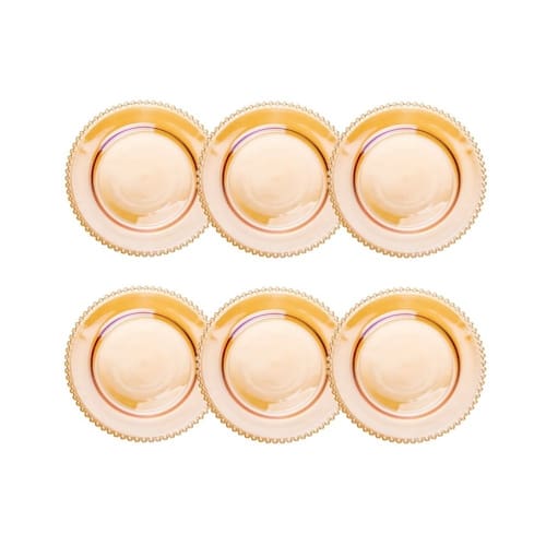 O Conjunto de 6 Pratos para Sobremesa da Wolff Pearl Âmbar de 20cm é um jogo elegante em cristal, com design sofisticado que lembra pérolas (bolinhas) na borda, na cor âmbar, ideal para adicionar requinte à mesa posta, servindo sobremesas médias como bolos, tortas e mousses, com brilho e durabilidade que transformam qualquer refeição em um evento especial, e deve ser lavado com cuidado.