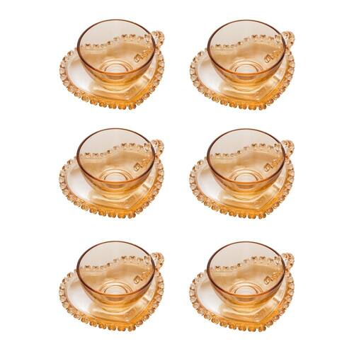 O conjunto de 6 xícaras para chá com pires de cristal da Lyor é um kit de 170ml com design romântico de coração, na cor âmbar metalizado, ideal para servir chás e cafés com elegância, destacando-se pelo material de cristal de alta qualidade e pelos detalhes delicados, exigindo lavagem manual com cuidado para preservar seu brilho.