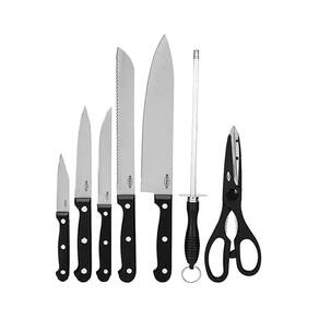 O conjunto de facas Daily é ideal para o preparo de suas receitas com corte de carnes, legumes, pães e outros alimentos com facilidade e precisão.As facas são bem afiadas, produzidas em aço inox, com lâmina chinfrada com rebites que não oxidam.Itens inclusos:01 Faca do Chef 8"01 Faca para desossar 7 ¼01 Faca para pão 7 ½"01 Faca para legumes 3 ½"01 Faca para cozinha 5"01 Tesoura 21,5cm01 Chaira 7 ½”01 Cepo de madeiraLÂMINA AÇO INOX CHANFRADA e REBITE NÃO OXIDA.